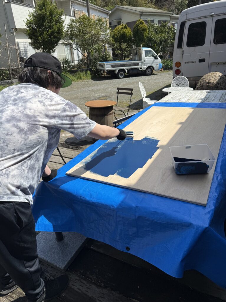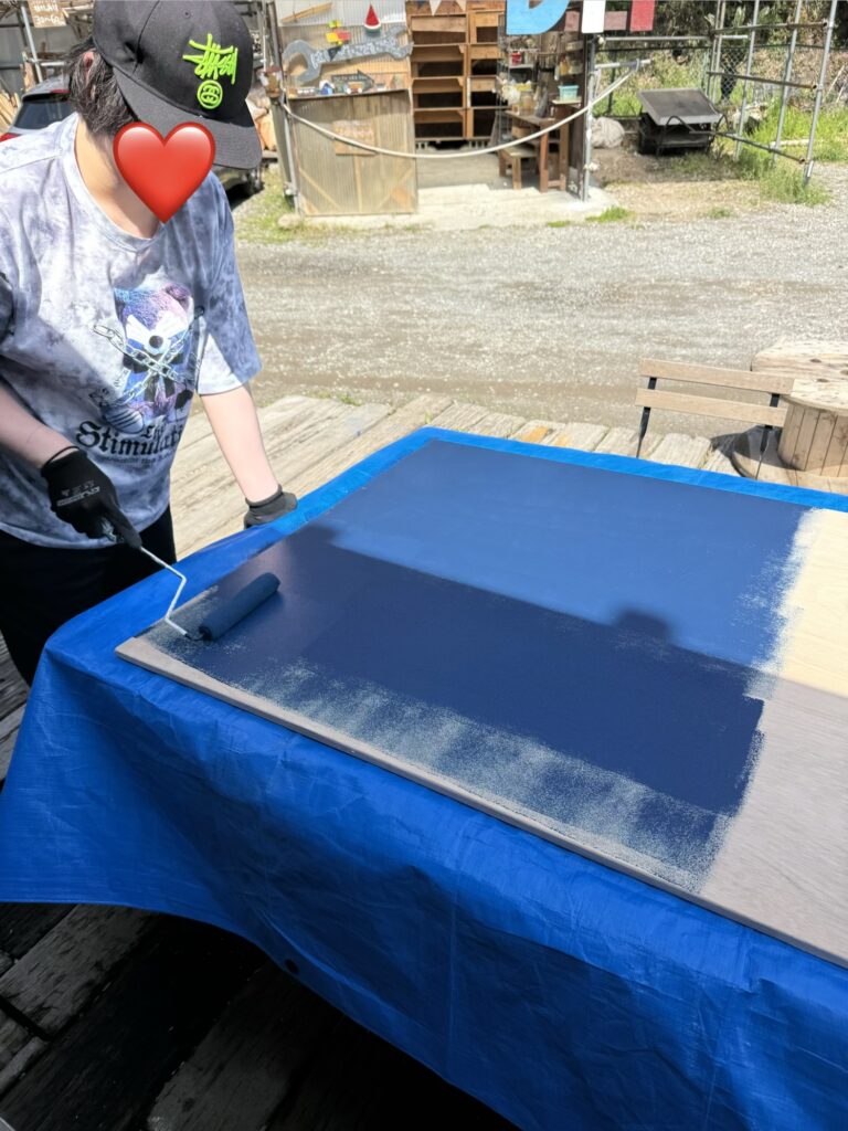 大きな板に力強くペンキ塗り〜🌈