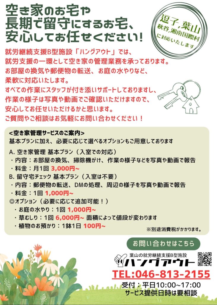 空き家のお宅や長期で留守にするお宅、安心してお任せください!